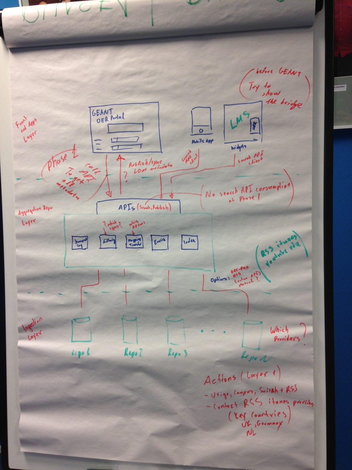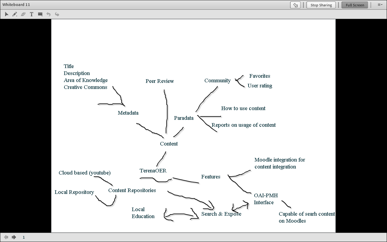 The attendees did a short brainstorming on the potential content of the study. Peter suggested that the study should start with a technical overview on the state-of-the-art content repositories and their basic characteristics. Giannis said that the overall picture should also be described including similar global (e.g., GLOBE) and European (e.g., openeducationeurope.eu) initiatives and their relation to TERENA OER. The basic information model, metadata schema, and protocol set should also be suggested by the study. Contribution to the user interface and the web front-end requirements is necessary. The functional description should look ahead to 3-5 years in time taking into account the latest trends in on-line teaching & learning  .
